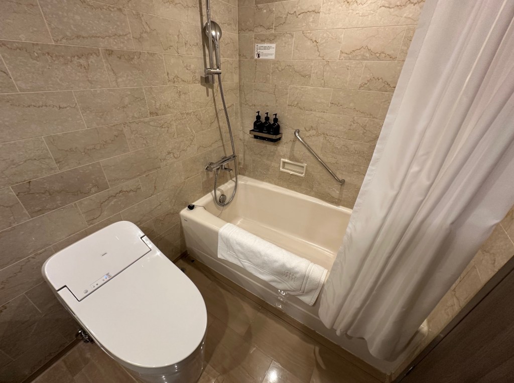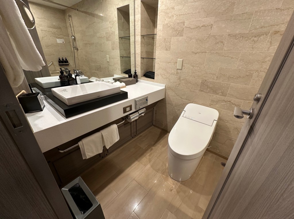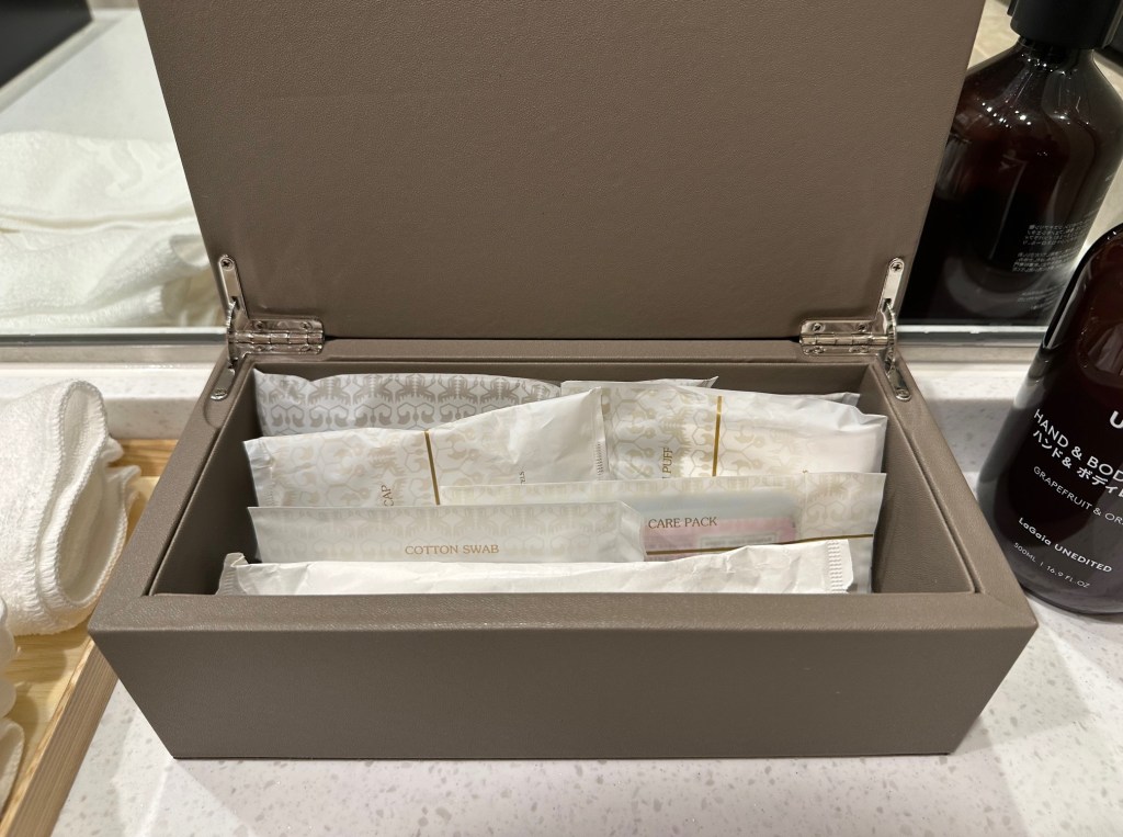 The bathroom follows a traditional Japanese layout but is decorated with high-end luxury materials. The amenity kit is fully stocked (toothbrushes, combs, razors), and a standout feature is the provided skincare cream, which is a great touch. The bath amenities are from the brand LUE.