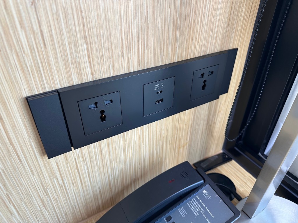 - There’s also a work desk area complete with a modern universal power outlet for charging devices.