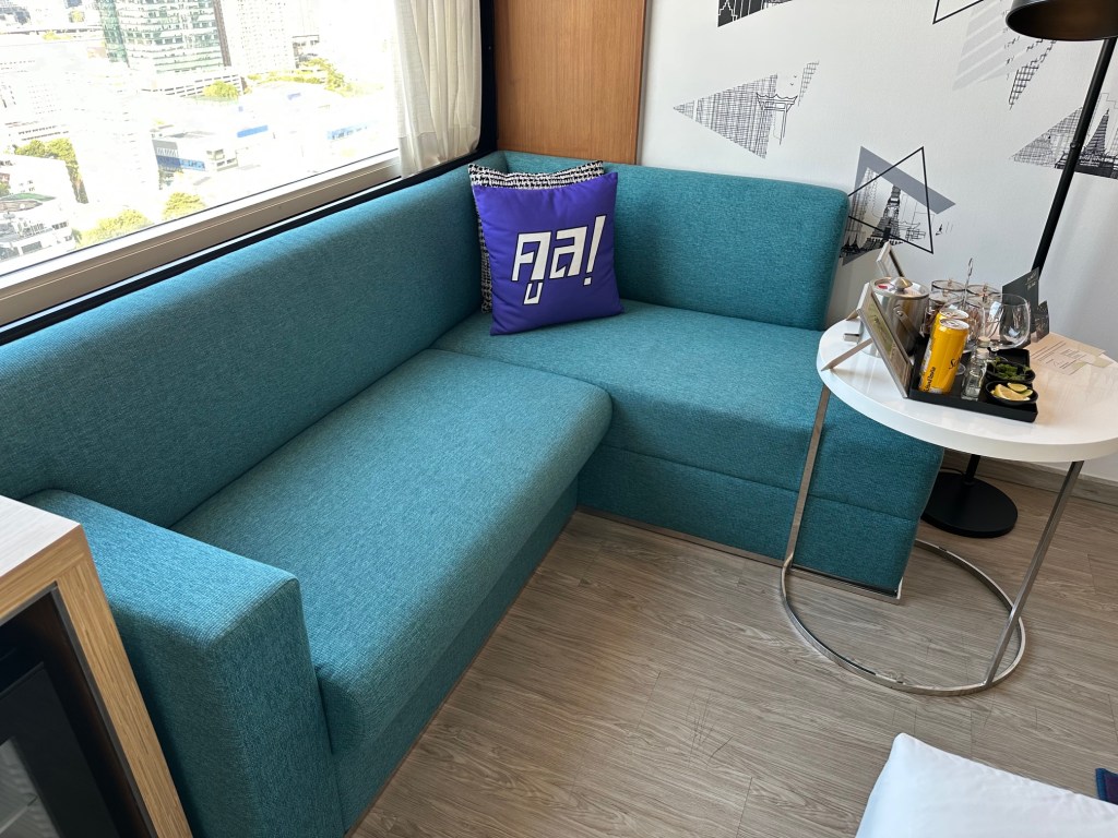 There is a sofa by the window where you can enjoy the beautiful view, along with a small table featuring complimentary welcome snacks and drinks.