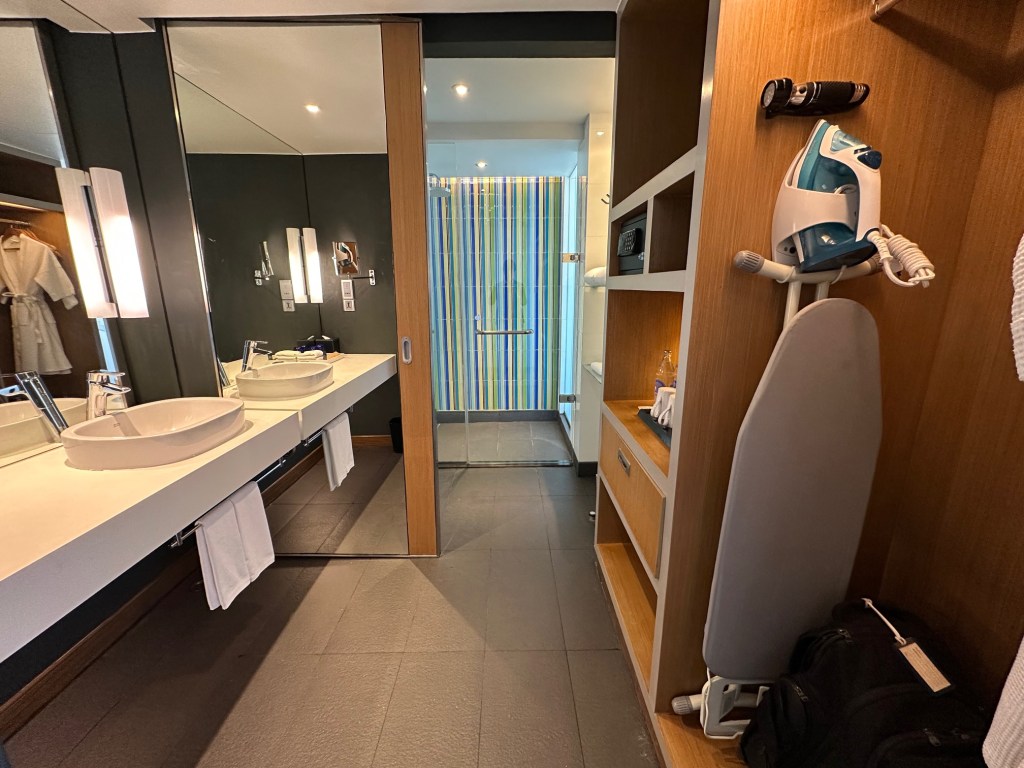 The floating coat rack is located in the bathroom area, along with a bathrobe, slippers, a safe, and an iron. The bathroom uses a shower (no bathtub), and the amenities provided are the drybar brand.