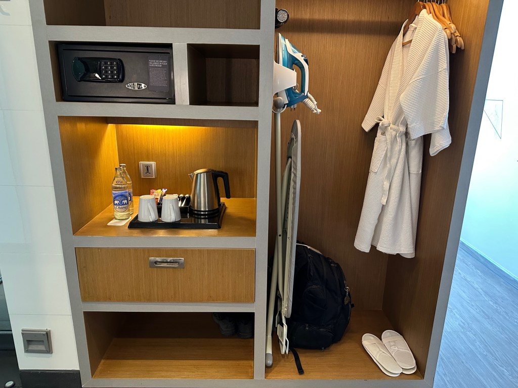 The floating coat rack is located in the bathroom area, along with a bathrobe, slippers, a safe, and an iron.