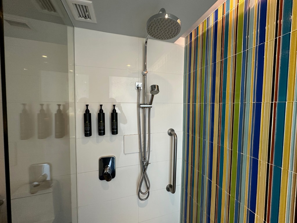 - The bathroom uses a shower (no bathtub). The toiletries (amenities) provided are the drybar brand.