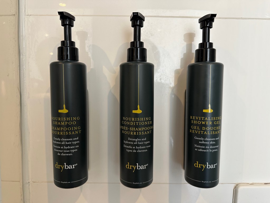 The bathroom uses a shower (no bathtub), and the amenities provided are the drybar brand.