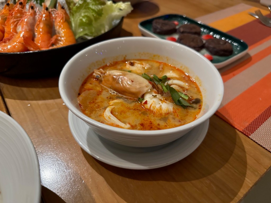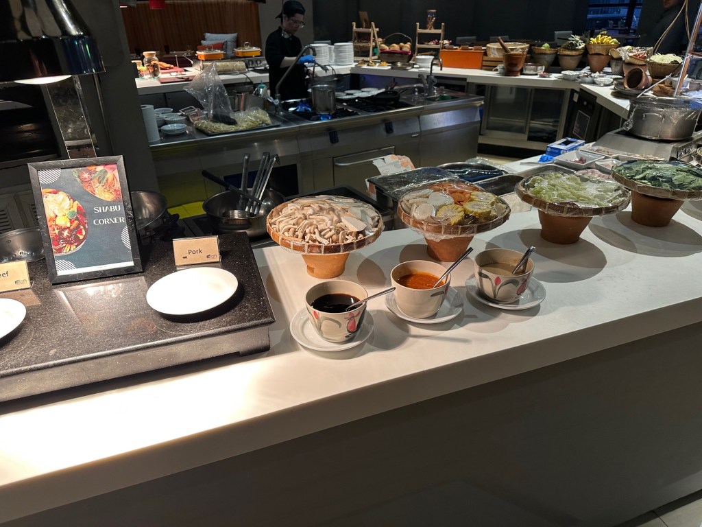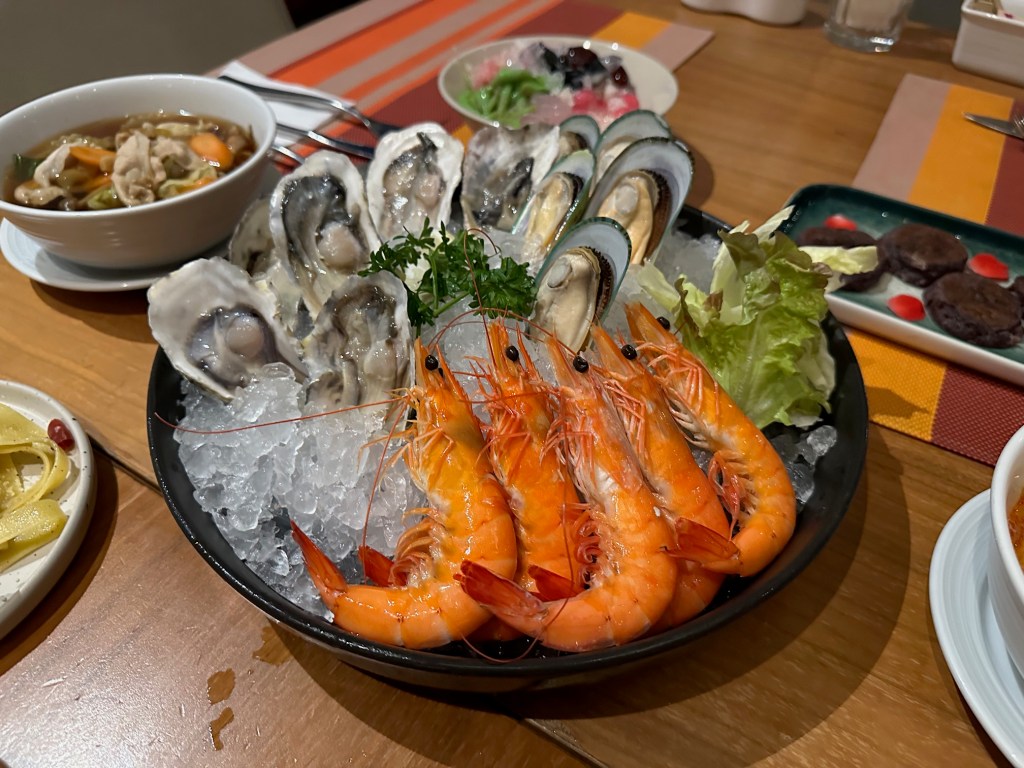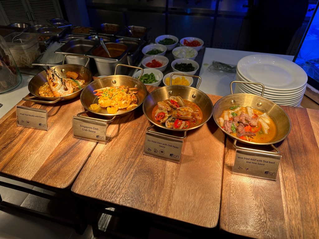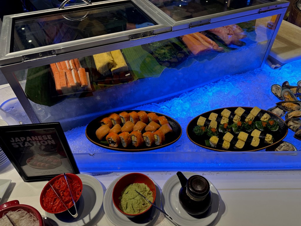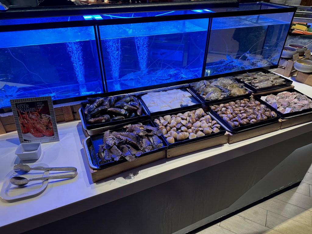 Starting with the Seafood line/section, dishes are prepared fresh, plate by plate. This includes prawns, slipper lobsters, squid, crab, and there is also sashimi (raw fish).