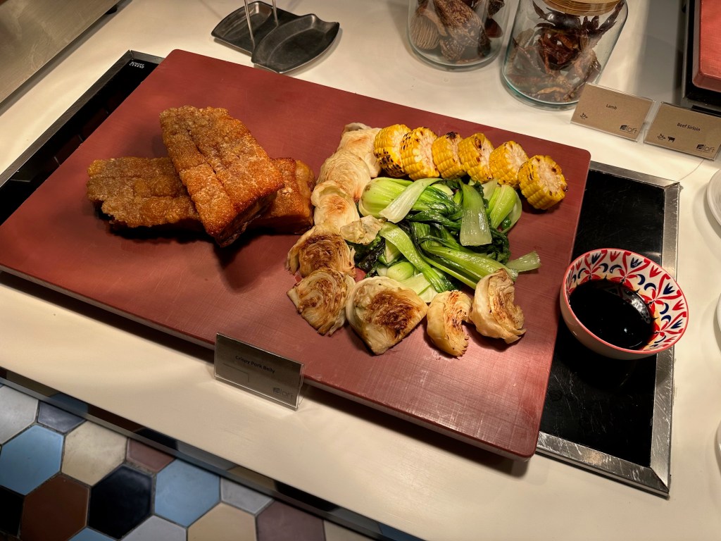 Crispy pork belly and grilled vegetables.