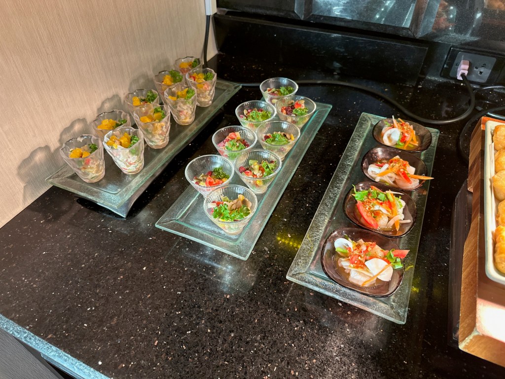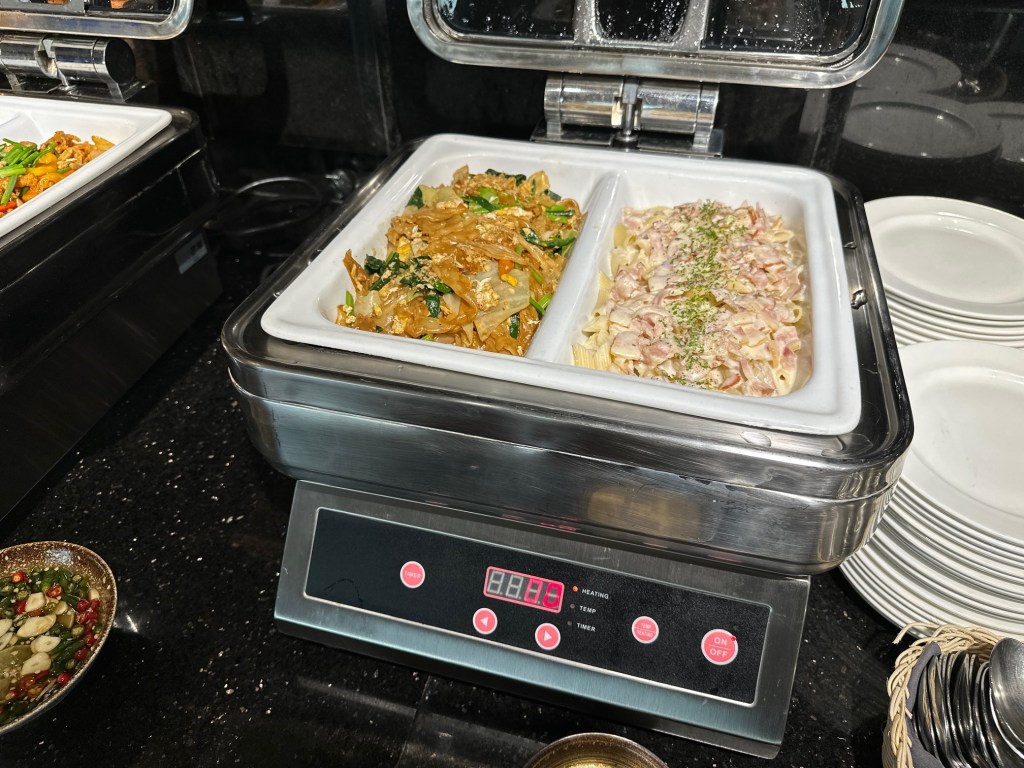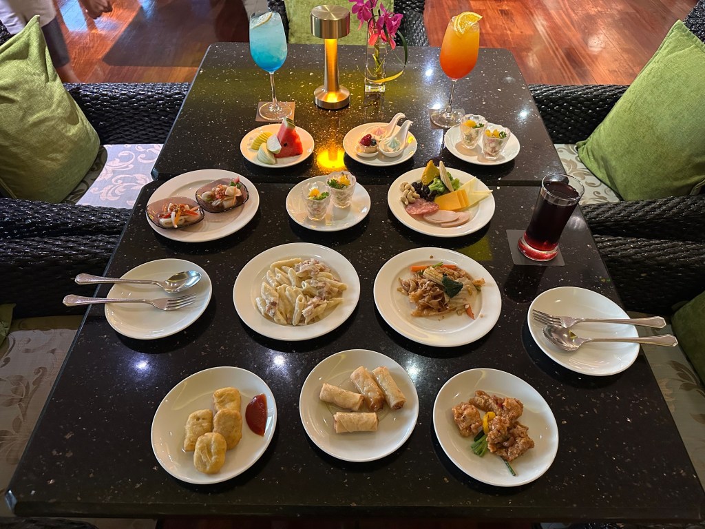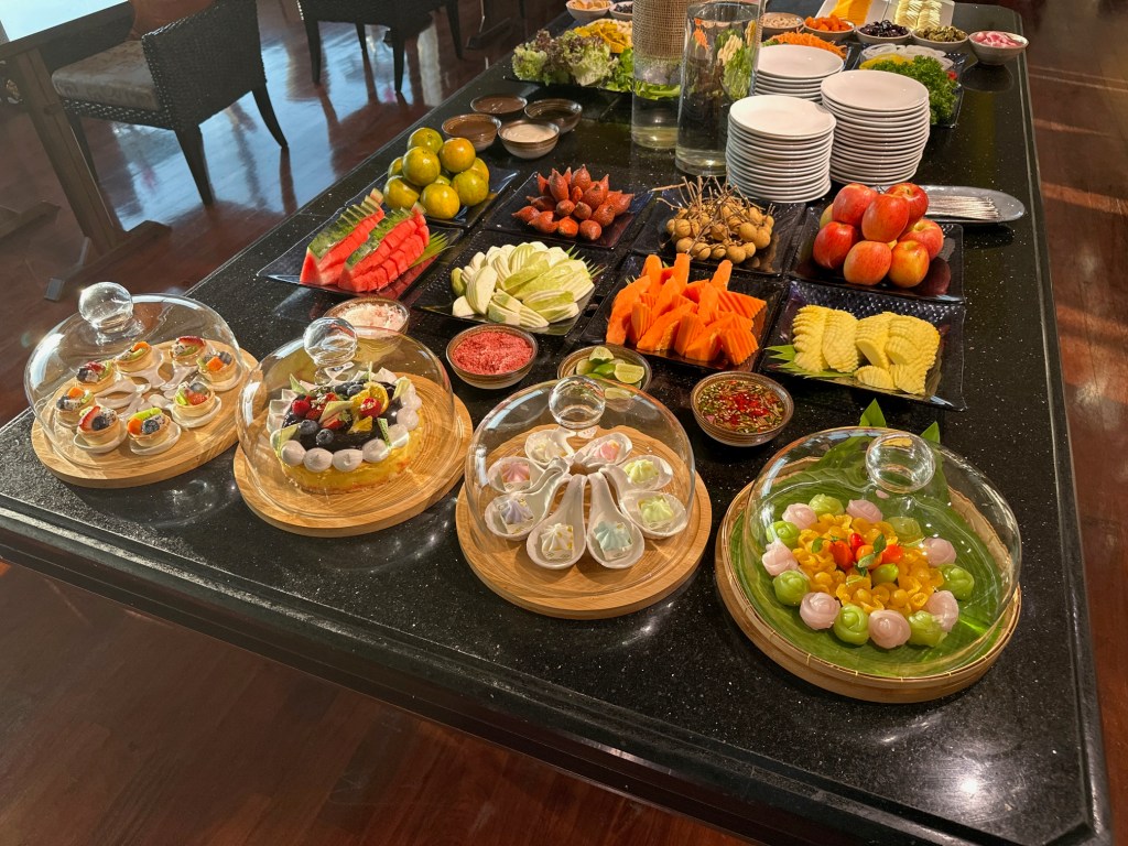 The Evening Cocktail session is where they truly go all out—classic AWC style! The spread is incredibly generous, featuring everything from rice dishes, chicken with cashew nuts, nuggets, and vegetable spring rolls to spicy seafood salad, Pad See Ew, and Carbonara. There is also a selection of cheeses, cold cuts, fruit, whole cakes, and Thai desserts, all served alongside alcoholic beverages.
