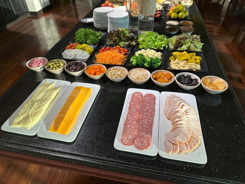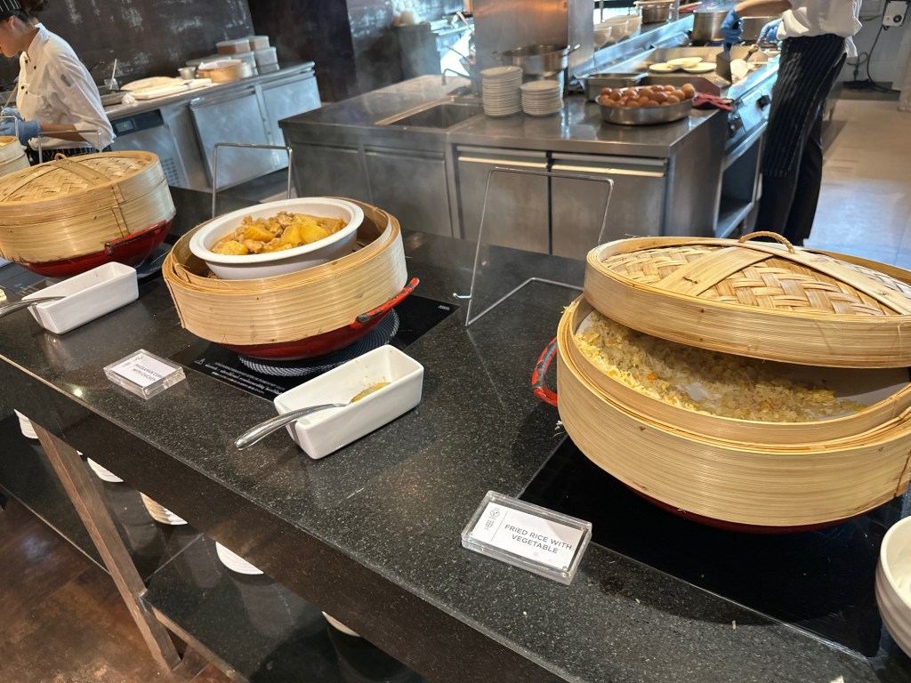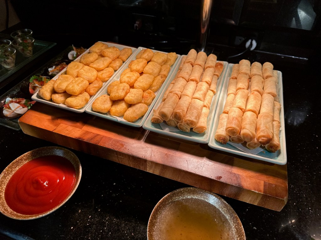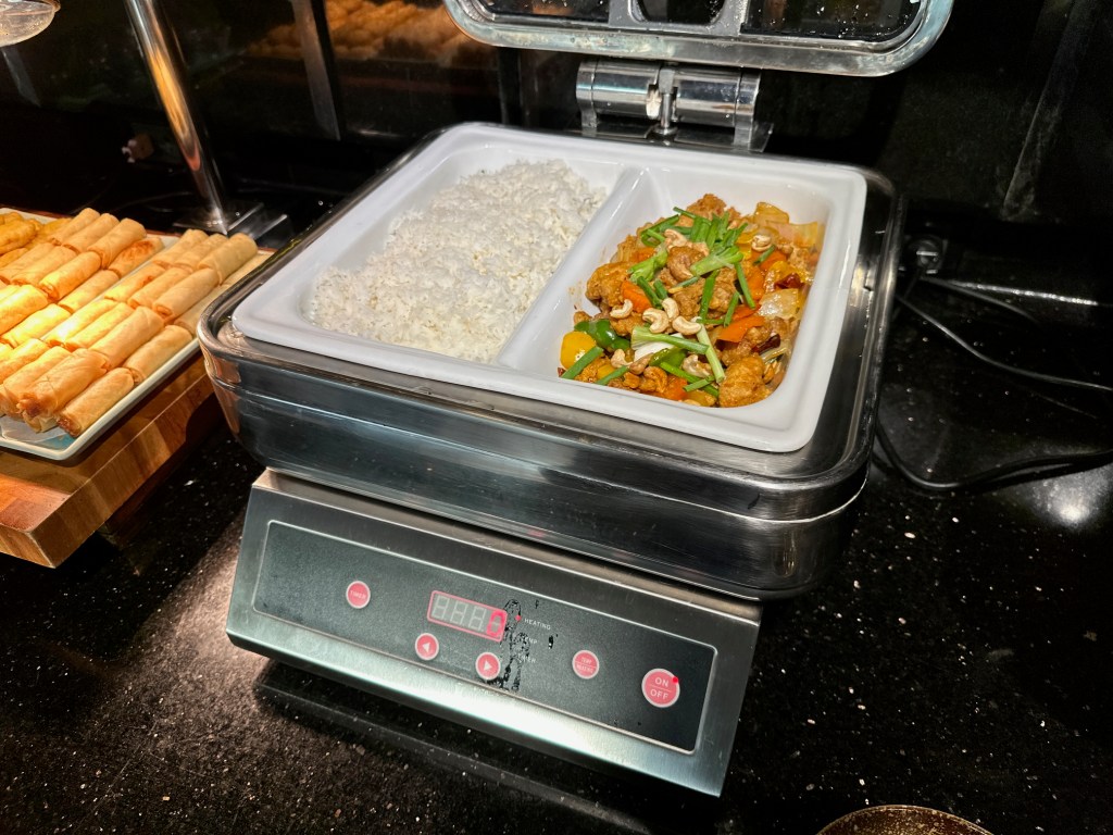The Evening Cocktail session is where they truly go all out—classic AWC style! The spread is incredibly generous, featuring everything from rice dishes, chicken with cashew nuts, nuggets, and vegetable spring rolls to spicy seafood salad, Pad See Ew, and Carbonara. There is also a selection of cheeses, cold cuts, fruit, whole cakes, and Thai desserts, all served alongside alcoholic beverages.