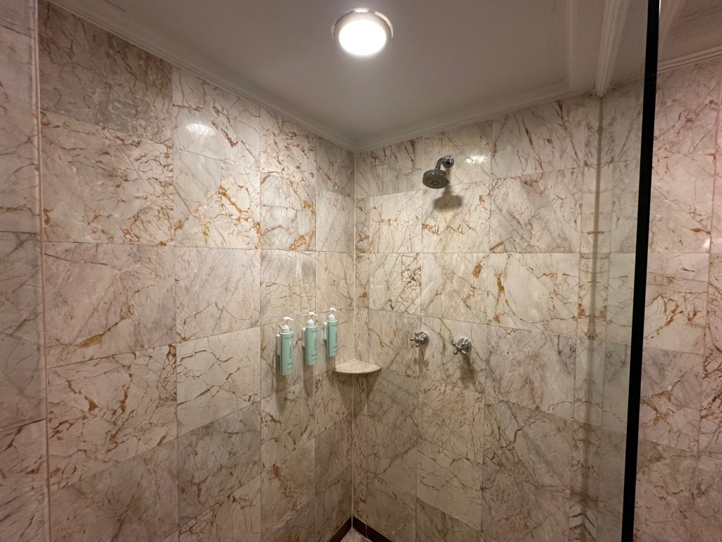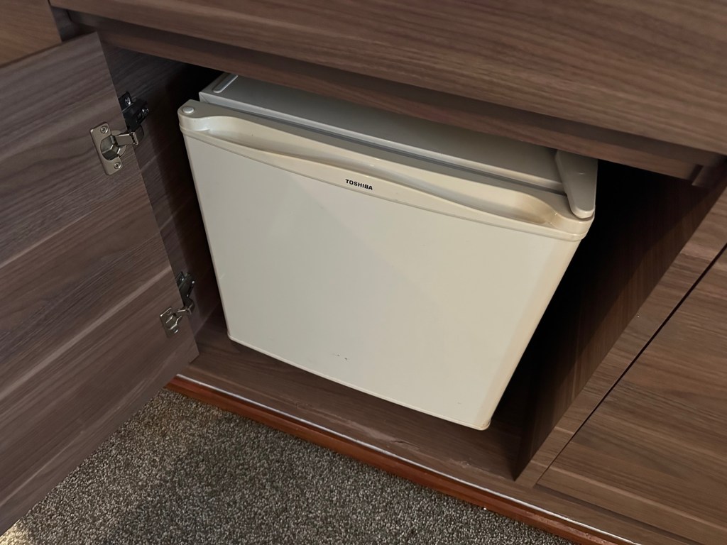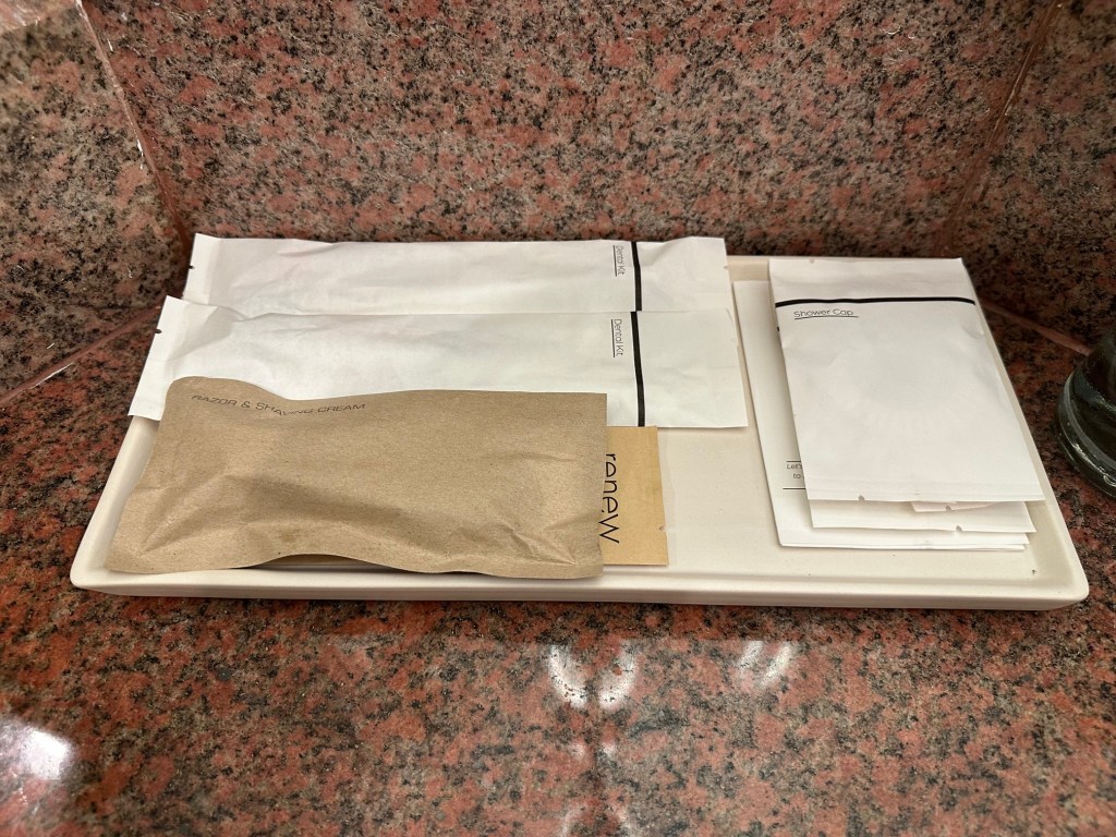 While the bedroom itself isn’t particularly large, it includes a bathroom with a bathtub and a complete set of amenities—including toothbrushes and a shaving kit—all from the brand Crabtree & Evelyn.