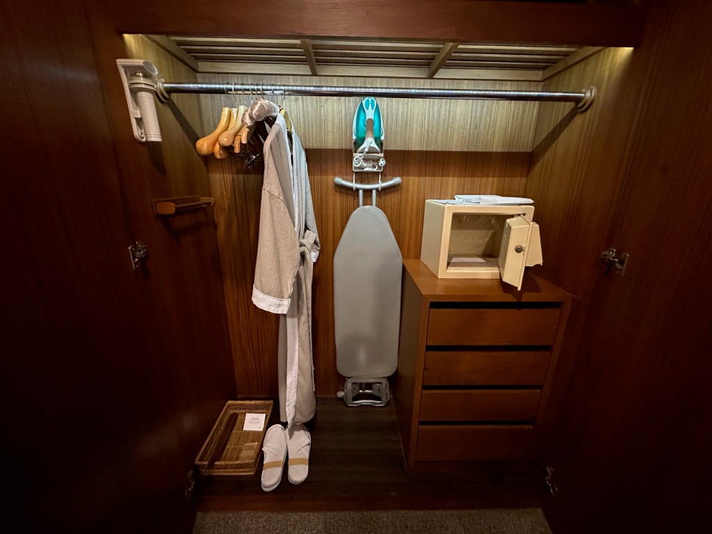 The suite features a large wardrobe fully equipped with bathrobes, slippers, an iron, and a safe.