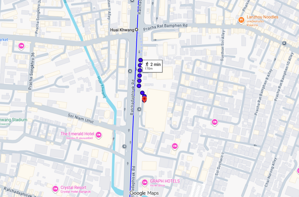Let’s get started. The hotel is located only 170 meters from MRT Huai Khwang, which is just a 2-minute walk.