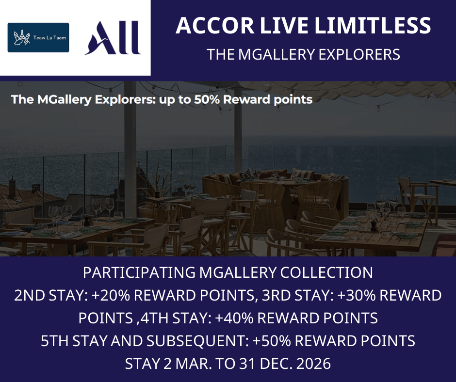 บวกโบนัสแต้มสูงสุด 50% เมื่อเข้าพักโรงแรมแบรนด์ MGallery นะครับ
