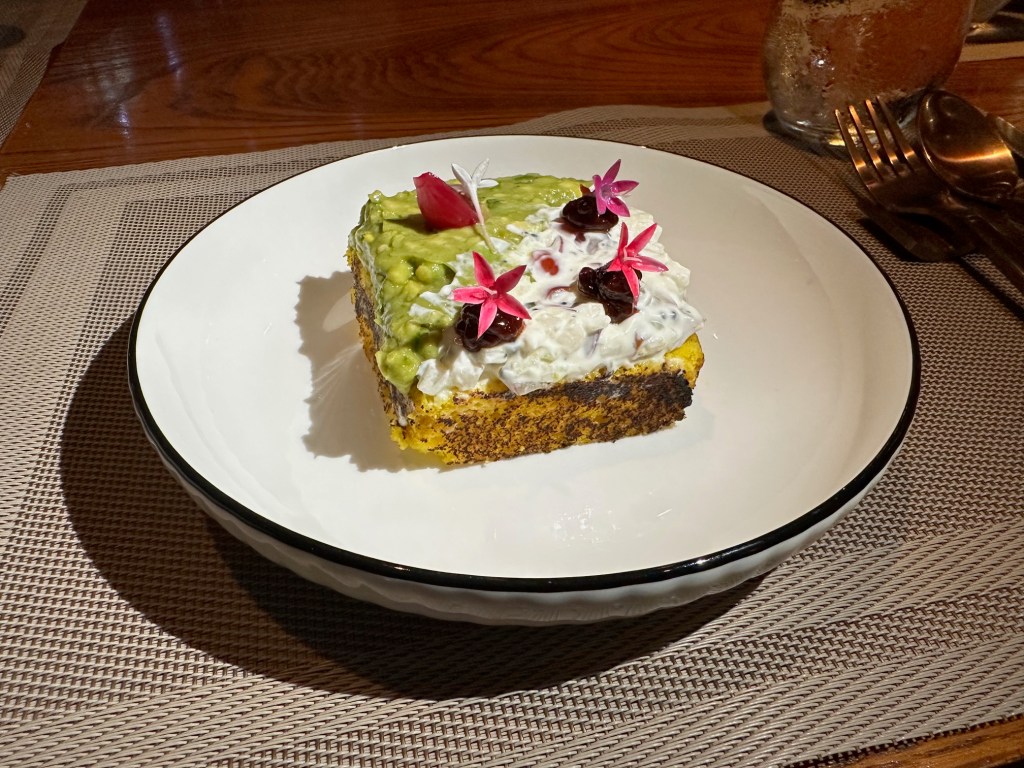 Avocado & Fruit Dhokla on Toast A steamed Bengal gram flour sponge (Dhokla) topped with spiced avocado mash and tropical fruit chutney.