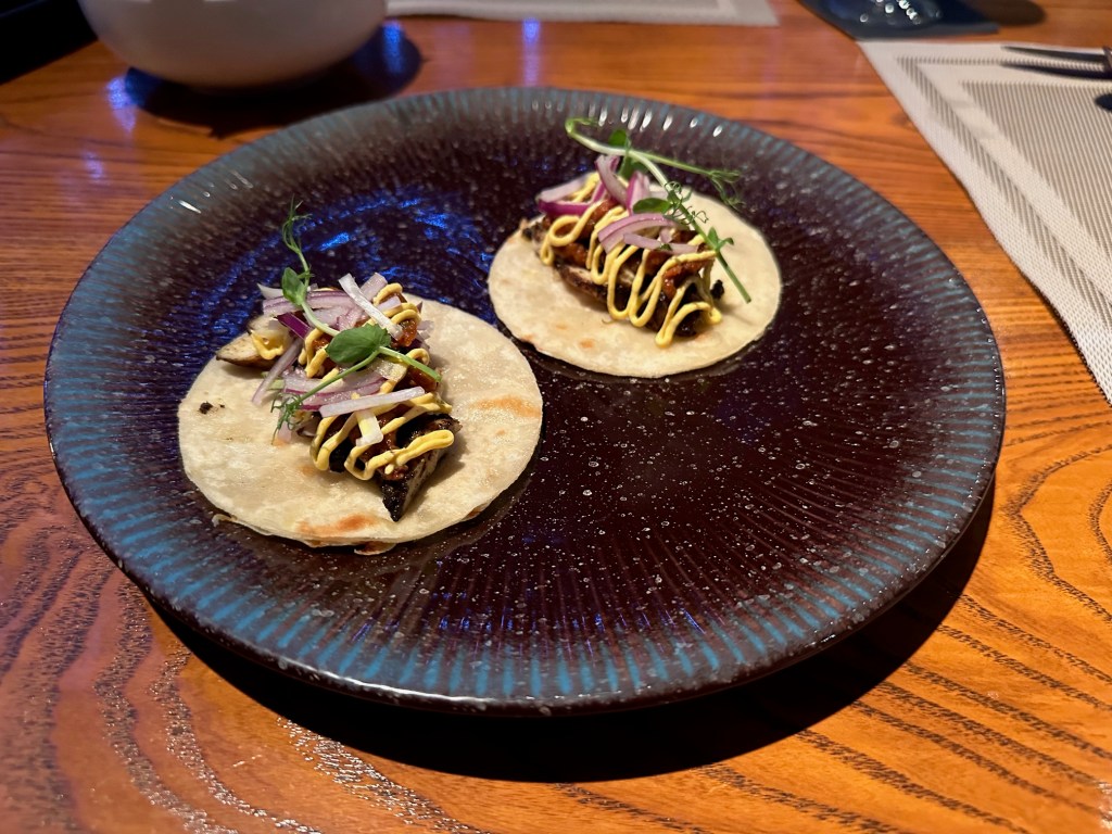 Black Masala Chicken Tacos Tender chicken thigh marinated in a signature spice blend from Central Maharashtra, flame-grilled to perfection, and served on a rice flour flatbread.