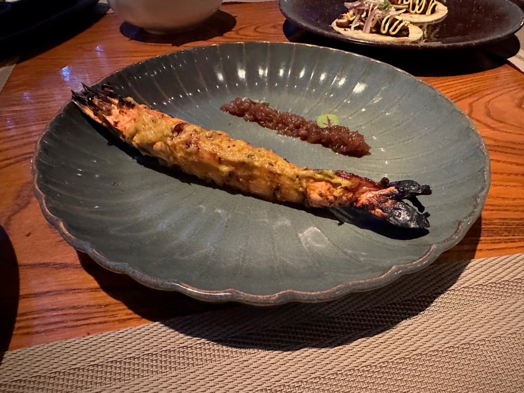 กุ้งลายเสือหมักพริกหยวกเหลืองเผาและน้ำส้มสายชูจากต้นปาล์ม เสิร์ฟพร้อมเครื่องเคียงลูกแพร์และอบเชย กุ้งลานเสือย่างได้ดี หมักได้รสชาติจัดจ้าน ตามสไตล์อาหารอินเดีย เครื่องเคียงรสชาติดีมากๆครับ ออกรสหวาน เข้ากันได้ กับกุ้งลายเสือ อร่อยมากกกกกกกก
