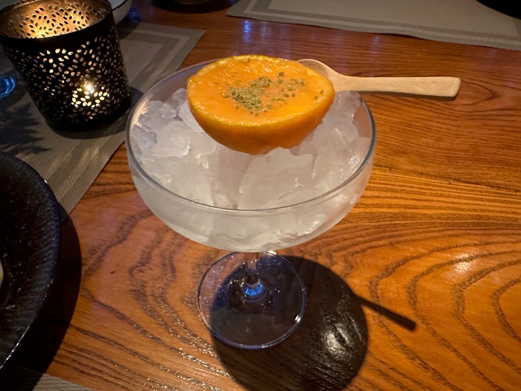 น้ำส้มคั้นสดแต่งกลิ่นด้วยผงยี่หร่าฝรั่ง (Fennel) และเกลือหิมาลัยสีชมพู จานนี้ ว้าวมากๆ นะครับเสิร์ฟมาพร้อมดรายไอซ์ เป็นส้มมาแบบเกร็ดน้ำแข็งเย็นๆ รสชาติมีเสน่ห์ ของเครื่องเทศอย่างยี่หร่าฝรั่ง ให้ความสดชื่น และรสชาติที่เอกลักษณ์