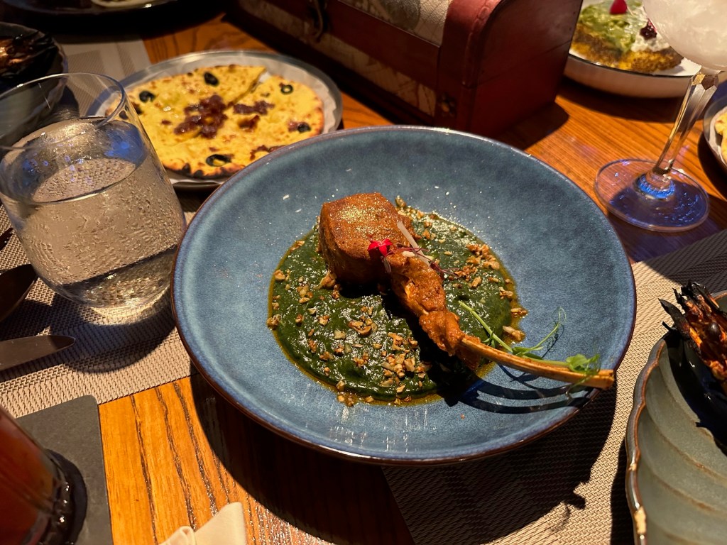 Saag Ghosht New Zealand lamb chops braised in fresh spinach and garlic paste, served with sundried tomato and olive missi roti.