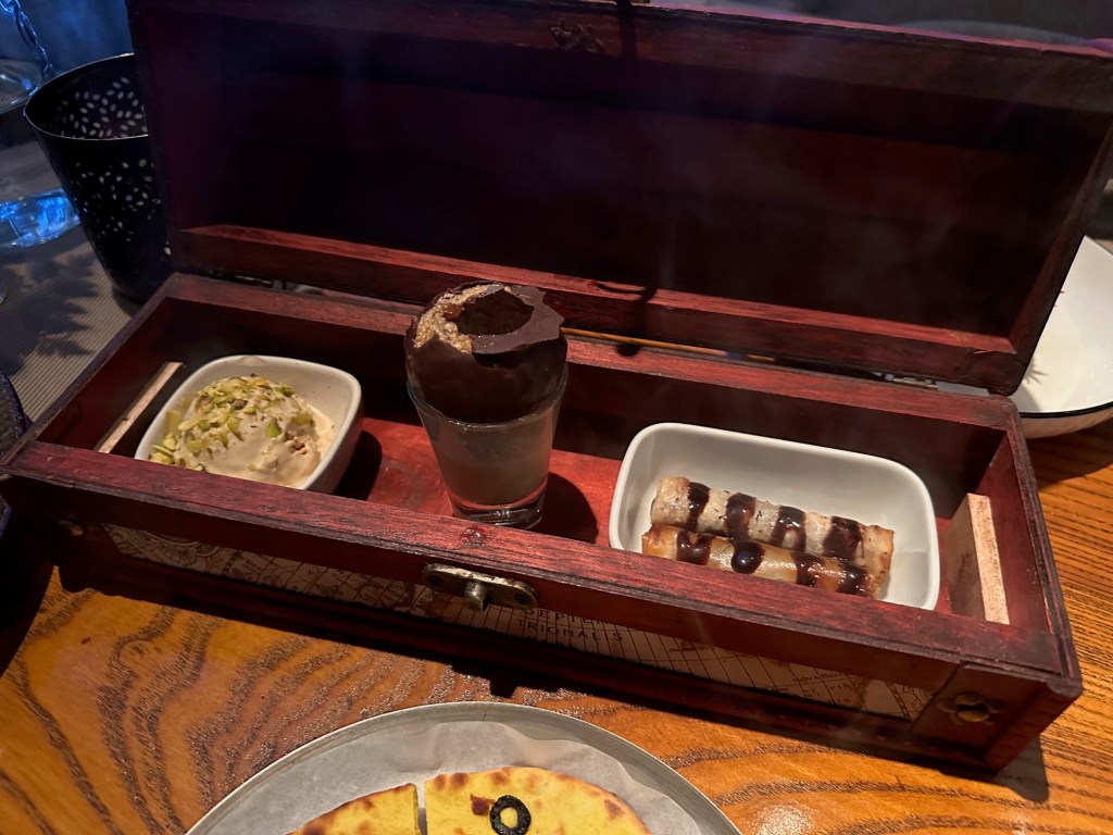 Chocolate Roll, Chocolate Pani Puri, and Masala Tea Ice Cream. This dessert trio is served in a stunningly beautiful box.