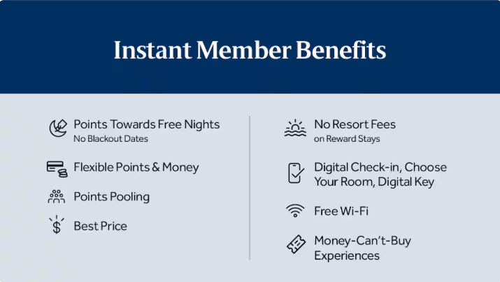 – ฟรีอาหารเช้าหรือของทานเล่น แล้วแต่แบรนด์โรงแรม และคลับเลาจน์สำหรับแบรนด์ Conrad Hilton หรือ ตลาดอเมริกาจะได้เป็นเครดิต F&B ซึ่งแตกต่างกันในแต่ละแบรนด์